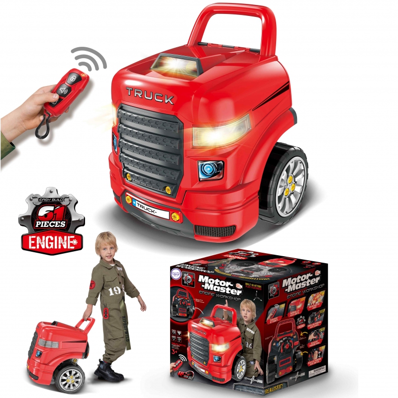 Zabawka imitująca przód ciężarówki marki WOOPIE z podnoszoną maską, kierownicą oraz deską rozdzielczą z drugiej. Po otworzeniu schowku pod kierownicą dziecko znajdzie w środku mnóstwo atrakcji w postaci narzędzi, pokręteł i śrub. Młody mechanik może dokonywać wielu napraw i przeglądów swojego pojazdu (np. kół, błotników, silnika, świec zapłonowych, grilla chłodnicy). Zabawka wyposażona jest w moduł dźwiękowy (odgłosy silnika i klakson) i świetlny (świecą reflektory). Dodatkowo w zestawie jest pilot umożliwiający sterowanie modułami. W celu zdjęcia kół można zastosować umieszczony w zabawce podnośnik. Z całą pewnością jest to zestaw jedyny w swoim rodzaju, oferujący niezliczoną ilość możliwości zabawy.