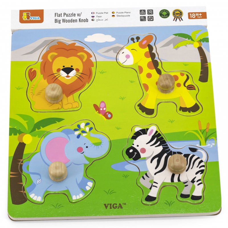 Drewniane puzzle z dzikimi zwierzętami od renomowanej marki Viga to jedna z czołowych zabawek, która posłuży nie tylko jako tradycyjna układanka, ale pozwoli dziecku ćwiczyć zdolności manualne oraz rozpoznanie kształtów zwierząt. Taka gra dla dziecka od 12 miesiąca życia pomoże kształtować precyzję ruchów rączek, oraz poprawić koordynację wzrokowo-ruchową, a także ćwiczyć pamięć, logiczne myślenie i koncentrację. Kolorowe puzzle cieszą oko i zachęcają do zabawy. W zestawie znajdują się 4 puzzle z różnymi zwierzętami o różnych kształtach. Puzzle posiadają uchwyty, dzięki którym maluch z łatwością będzie mógł je podnosić i układać w pasujące miejsce na planszy.