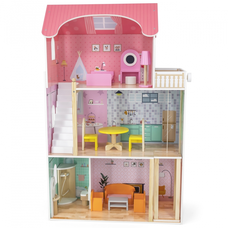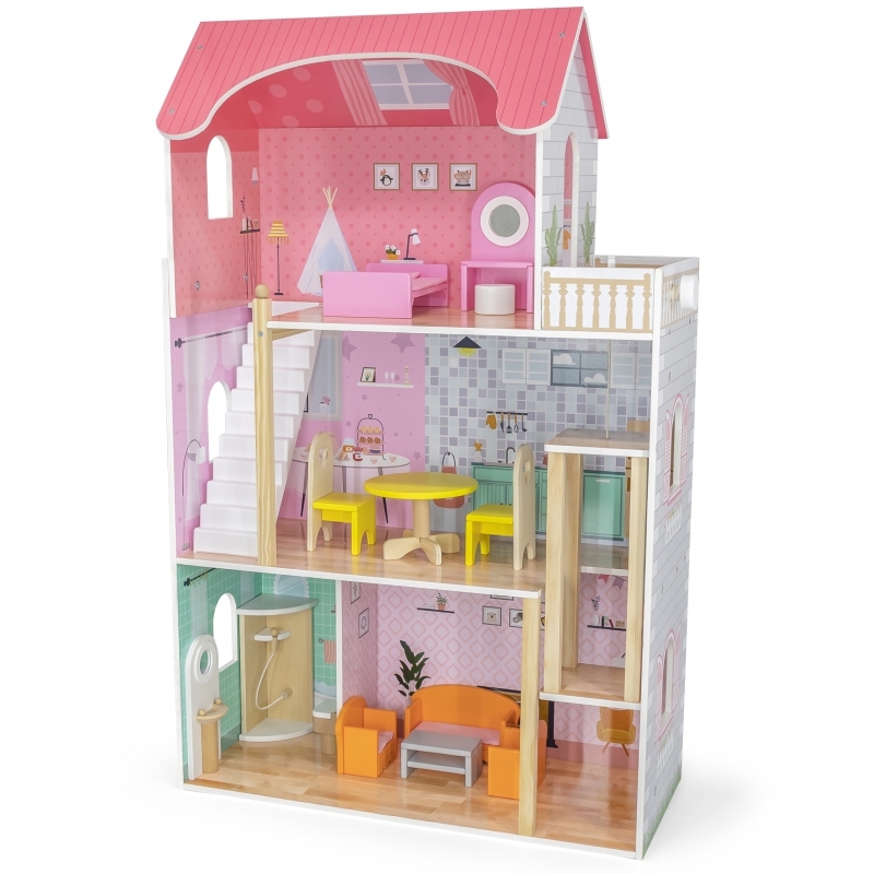 Drewniany domek dla lalek to idealna zabawka dla dziewczynek. W domku znajdziemy wiele pomieszczeń, dzięki czemu każda dziewczynka może odgrywać każdą rolę swoimi małymi laleczkami, figurkami, czy misiami.