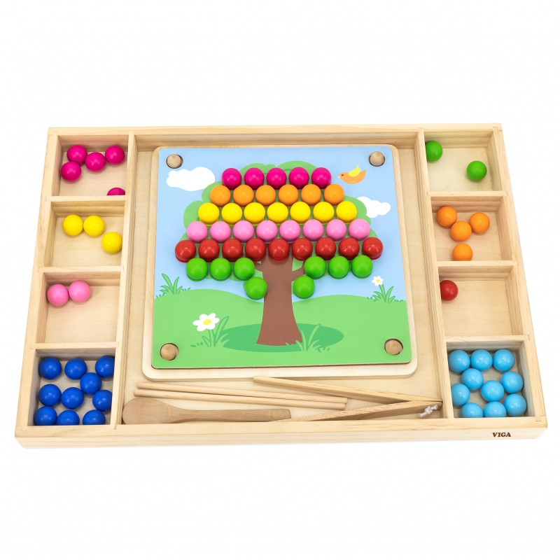 Drewniana gra "Złap i dopasuj" marki Viga. Zadanie dzieci jest nie tylko dopasowywać kolory według wzoru na papierze, ale także tworzyć więcej wzorów dzięki swojej wyobraźni. Ta gra może znacznie ćwiczyć koordynację ręka-oko i koncentrację dziecka.Dzieci mogą przymocować ulubiony papier do drewnianej tacy. Za pomocą pałeczek, łyżki lub spinacza przyczepić kulki do otworów na desce według wzorów i kolorów, a na koniec ułożyć je w piękny obrazek.