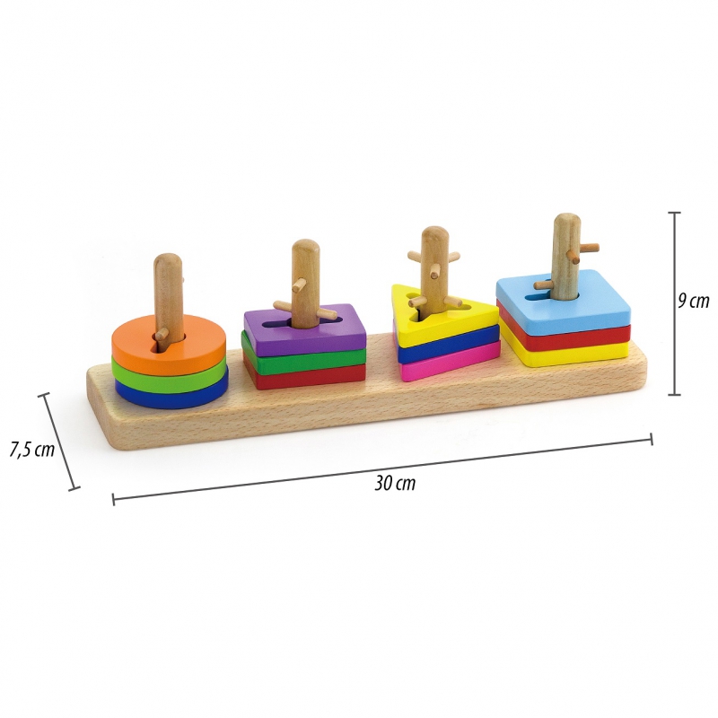 W zestawie znajduje się 12 kolorowych klocków z różnorodnymi otworami, które należy dopasować do kołeczków znajdujących się na drewnianej podstawie. Tylko jeden kształt pasuje do danego słupka.