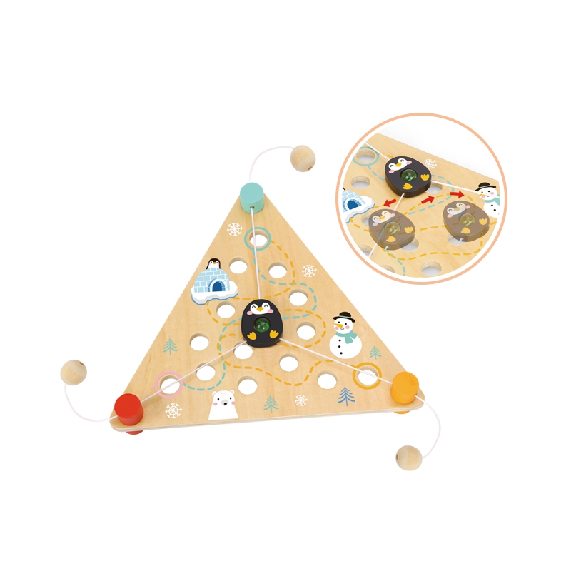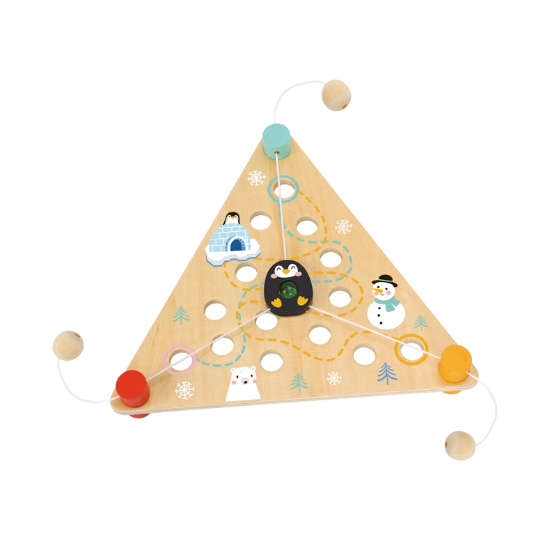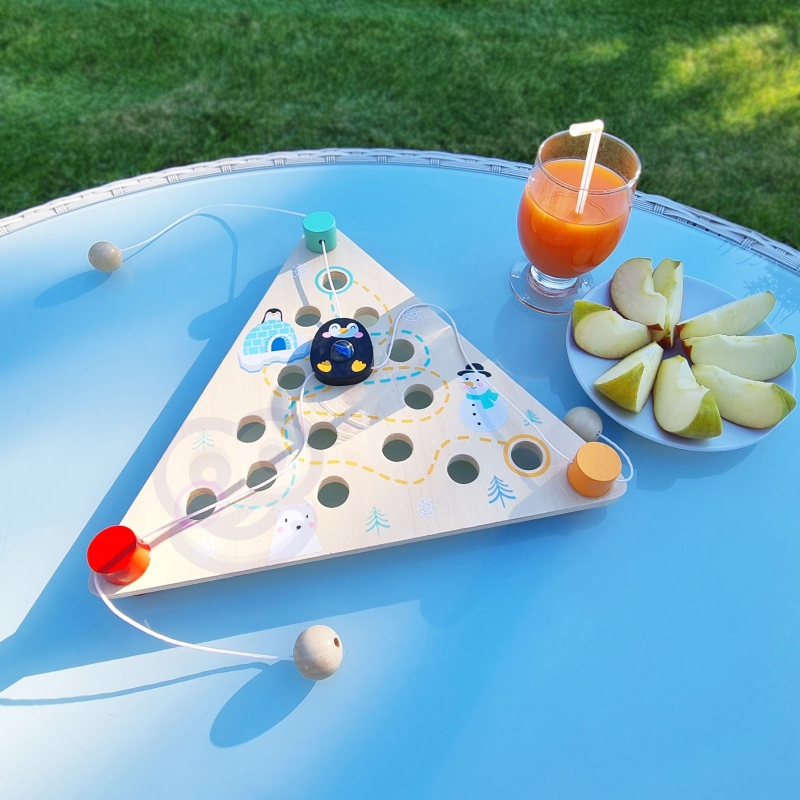 TOOKY TOY - gra składająca się z 3 elementów. Zabawa polega na tym, aby za pomocą sznurków przesuwać pingwinka, który ma kuleczkę w środku, tak żeby szedł po jednej z wyznaczonych ścieżek do celu i nie wpadł do dziurki. Produkt wykonany z wysokiej jakości materiału oraz pomalowany nietoksycznymi farbami. Układanka zaprojektowania z myślą o małych rączkach dziecka. Brak ostrych krawędzi sprawia, że jest w 100% bezpieczna dla naszej pociechy. Żywe kolory oraz elementy, że nikt obojętnie nie przejdzie obok tej układanki. Dziecko bawiąc się wspomoże rozwój motoryki, zręczności oraz precyzji. Zabawy nie będzie końca!
