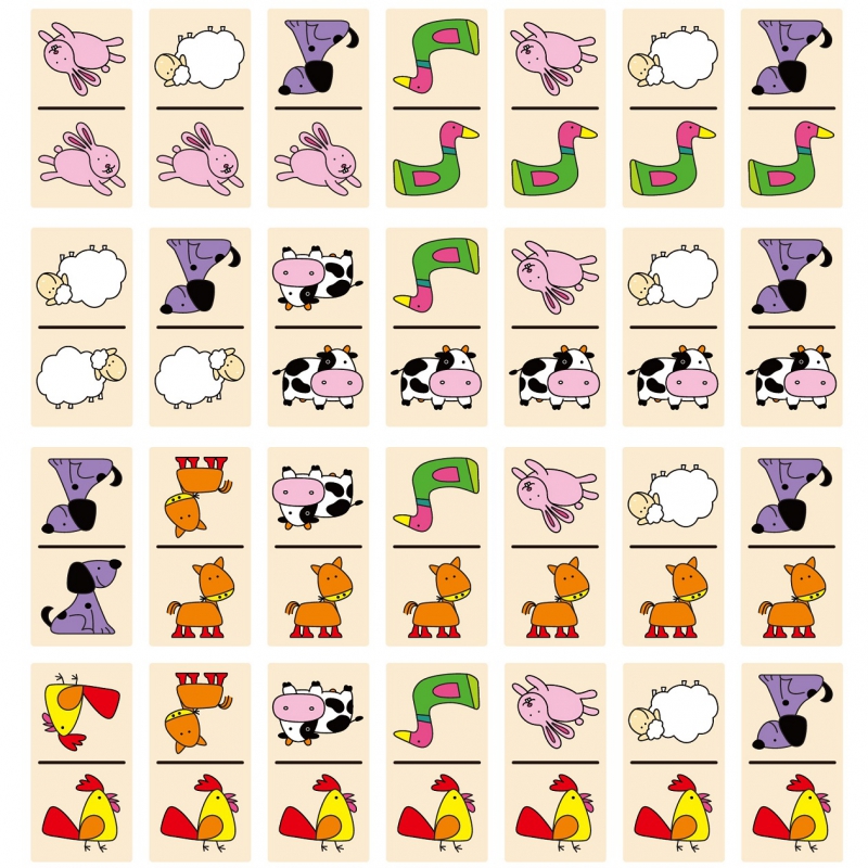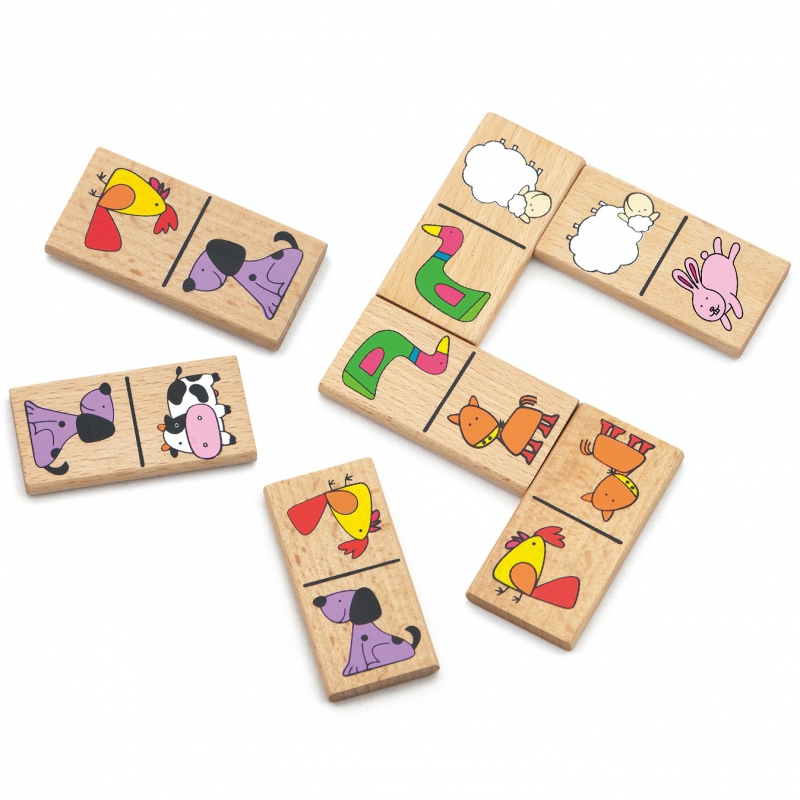 Celem gry jest ułożenie wszystkich klocków tak by końce dwóch sąsiadujących klocków miały ten sam obrazek. To idealna zabawka dla dzieci, które zaczynają przygodę z puzzlami. W zestawie znajduje się 28 drewnianych klocków domino z kolorowymi obrazkami, które przedstawiają zwierzątka takie jak piesek, kotek, owca, krówka itp/