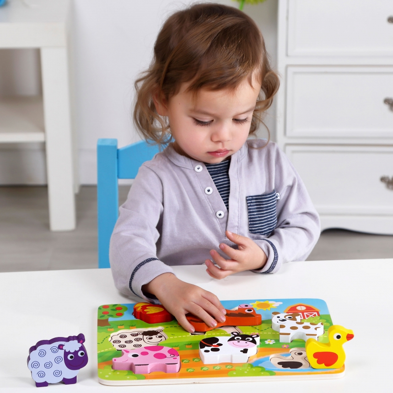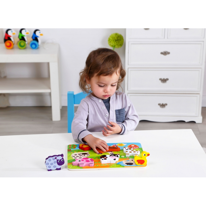 Drewniane Grube Puzzle od Tooky Toy dla dzieci od 12 miesiąca życia to idealne rozwiązanie do domu, jak i do przedszkola. Składa się z planszy, oraz 7 elementów ze zwierzątkami, które należy do niej zamontować. Na drewnianej podstawce znajdują się wgłębienia, które swoim kształtem odpowiadają kolorowym puzzlom. Dzięki zabawce dziecko rozwija koordynację wzrokowo-ruchową.