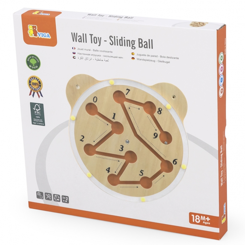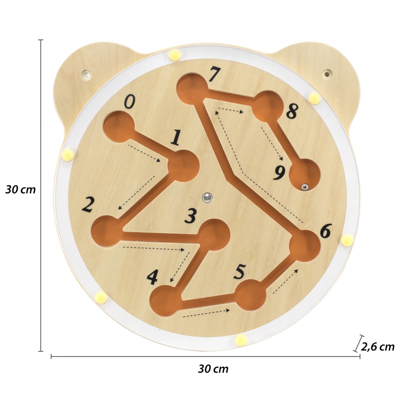 Jedna z serii drewnianych tablic z uroczą głową misia. Tablica dzięki obrotowej tarczy pozwala stalowej kuli na osiągnięcie kolejno każdej cyfry od 0 do 9. Zabawka pomaga w rozwijaniu koordynacji ręka-oko, w nauce liczenia oraz w zdolności rozwiązywania problemów - co ma kluczowe znaczenie w późniejszym życiu każdego młodego człowieka. Produkt idealnie sprawdzi się zarówno w domowym zaciszu, jak i w placówkach oświatowych, wczesnoszkolnych. Ciekawe przygotowanie formy tablicy z pewnością przykuje uwagę każdego malucha. Całość wykonana została z drewna lakierowanego i pomalowana nietoksycznymi farbami w żywe barwy, które zadowolą każdego użytkownika i dadzą mnóstwo radości z zabawy. Produkt przeznaczony dla dzieci od 18 miesiąca życia. W naszej ofercie dostępna jest cała seria tablic z głową misia.