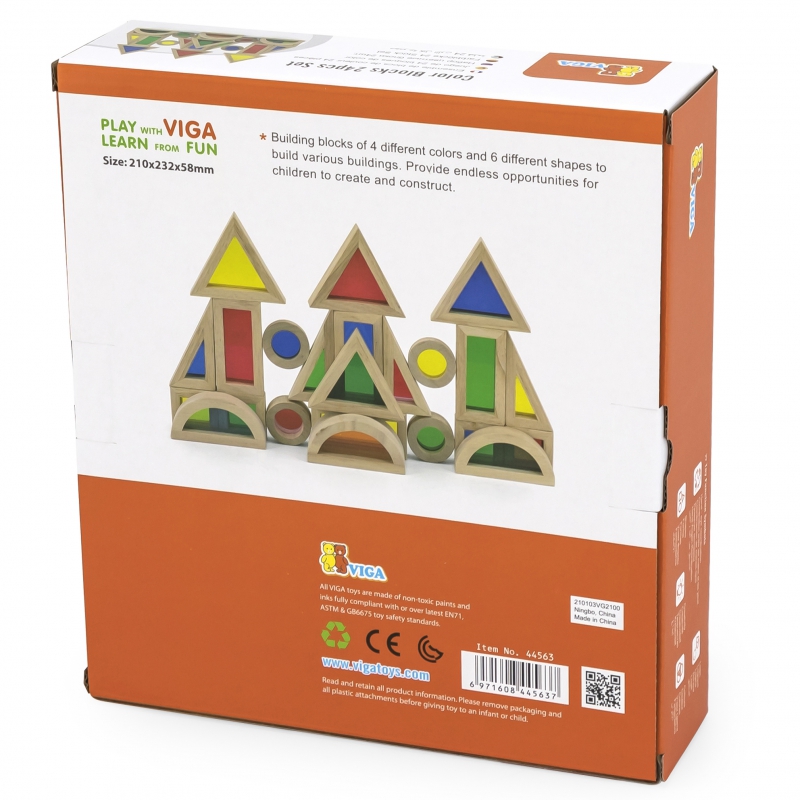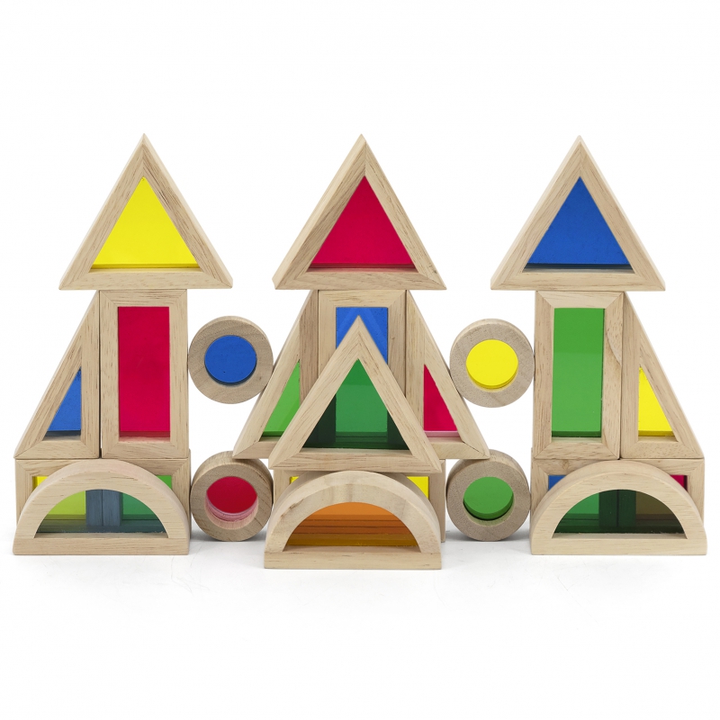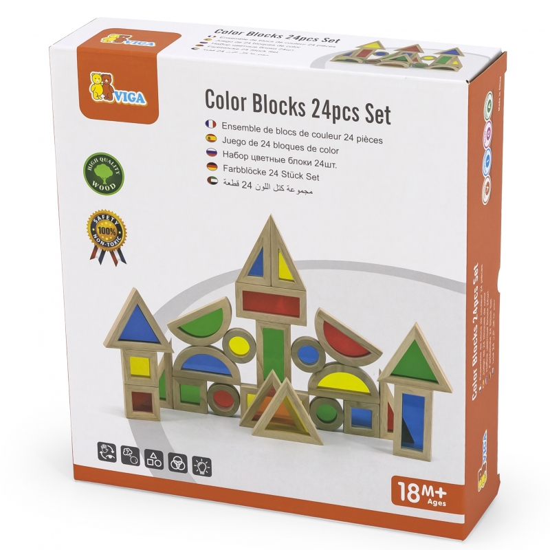- - zestaw składa się z 24 drewnianych dwustronnych klocków z kolorowymi szkiełkami