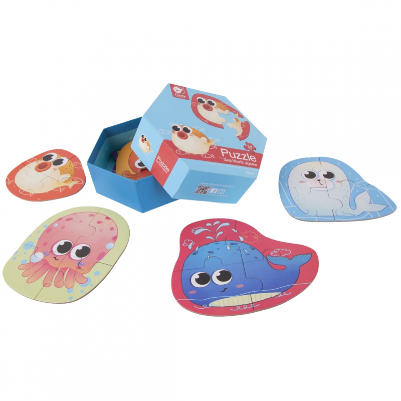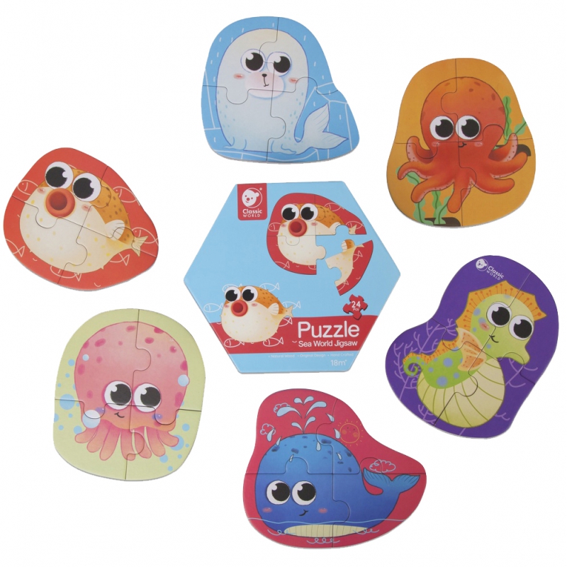 Drewniane Puzzle od Classic World dla dzieci od 18 miesiąca życia to idealne rozwiązanie do domu, jak i do przedszkola. Zestaw składa się z 6 obrazków do ułożenia a każdy z obrazków składa się z 4 klocków. Na obrazkach przedstawione są kolorowe zwierzątka wodne.