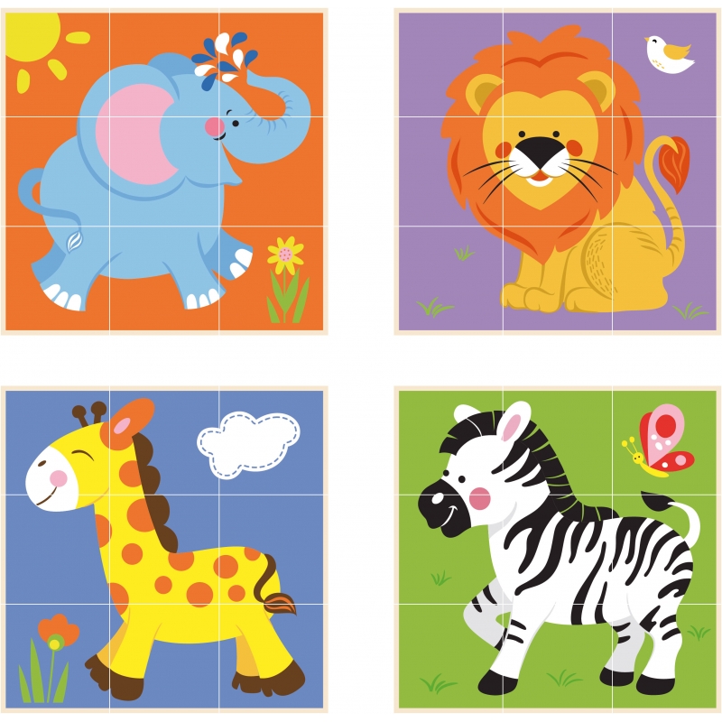 W zestawie znajduje się 9 klocków z kolorowymi obrazkami, które przedstawiają różne dzikie zwierzęta takie jak: