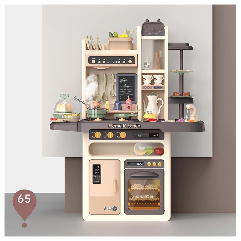 Kuchnia Domowa Wielofunkcyjna Home Kitchen marki Woopie jest wszystkim czego potrzeba dla młodego kucharza. Niezwykłe efekty pozwolą poczuć się twojemu dziecku jak w prawdziwej kuchni. Zacznij gotować, a po włączeniu pierwszego pokrętła włącza się pierwszy palnik, zaczną świecić światła oraz z palnika wydobywa się para imitująca prawdziwą z dźwiękiem gotującej się wody (para nie jest gorąca, całkowicie bezpieczna). Home Kitchen posiada okap z lampką, który po włączeniu przycisku on/off wydobywa z siebie melodie, dodatkowo temu wszystkiemu towarzyszą świecące światła. Okap posiada guzik funkcyjny z nutką oraz dwustopniową regulację głośności. Kuchnia wyposażona jest w kran z wodą (obieg zamknięty, woda wylatuje z kranu poprzez naciskanie pompki). Posiada jajowar, aby ugotować jajka, wystarczy nacisnąć przycisk i zapali się lampka LED, po czym z urządzenia będzie wydobywać się dźwięk gotowania (jajka będą się kręcić, imitując gotowanie). Codzienne menu zapiszesz za pomocą tablicy kredowej (kreda i gąbka w zestawie).